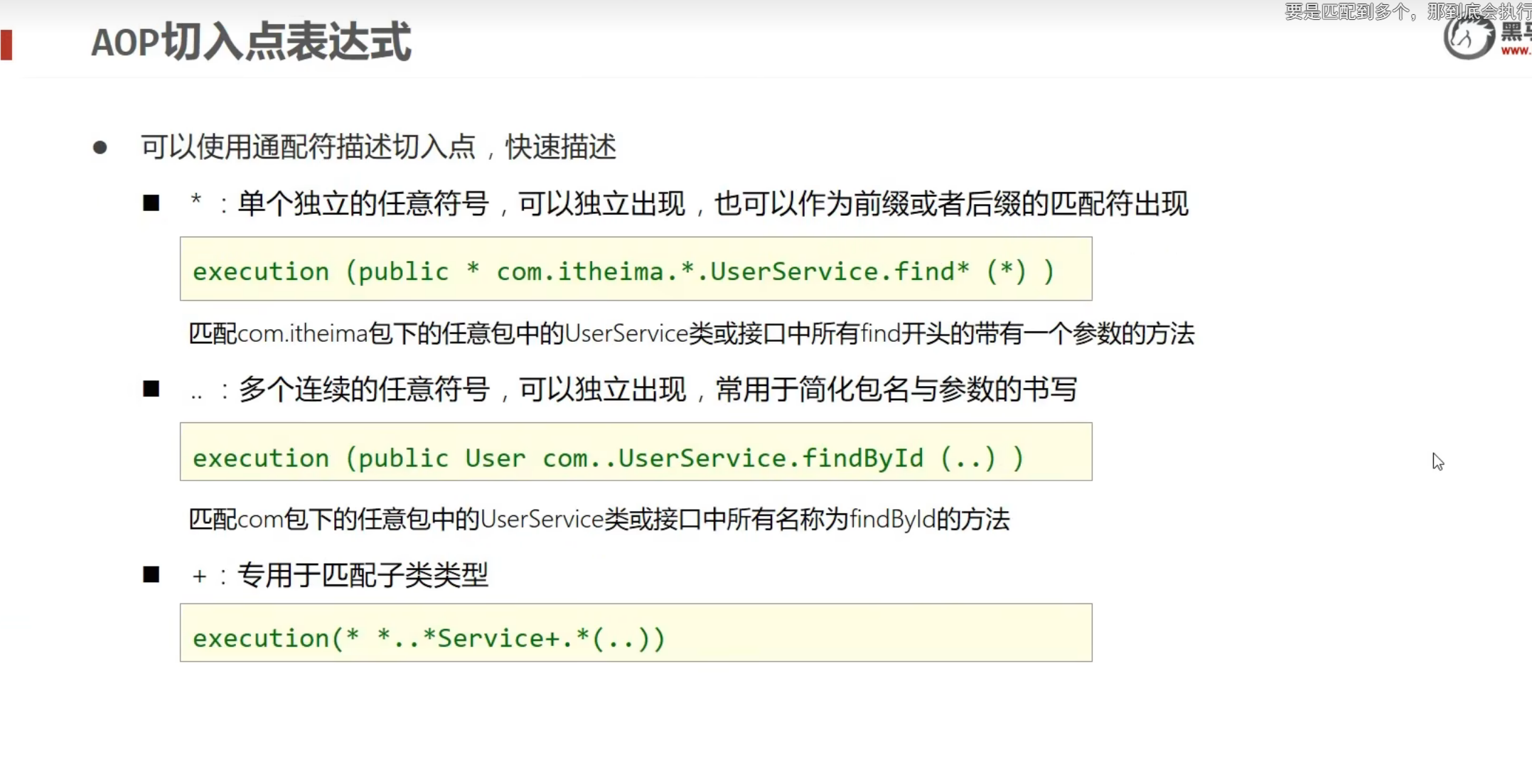 匹配多个方法,所有的save方法,所有get开头的方法,所有Dao的结尾的接口中的任意方法,所以带有一个参数的方法