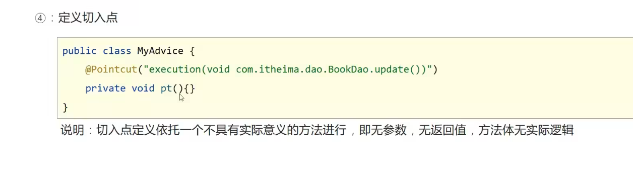 切入点定义依托一个不具有实际意义的方法进行,即无参数,无返回值,方法体无实际逻辑