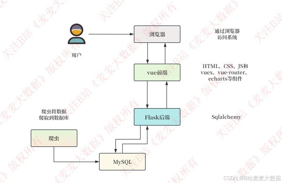 - 可视化分析:从MySQL读取数据 → 调用ECharts绘制多图表 → 前端渲染。