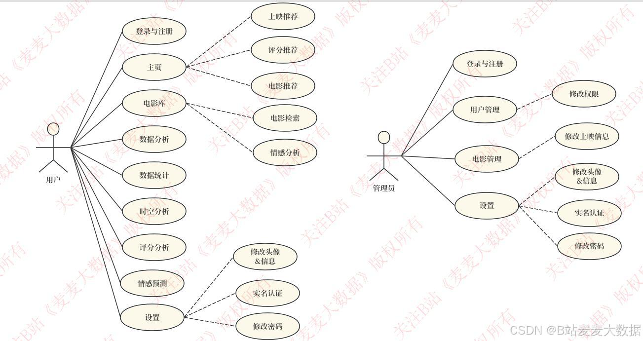 - 管理员角色拥有用户管理(增删改查、权限分配)和电影管理(增删改查、状态设置)权限。