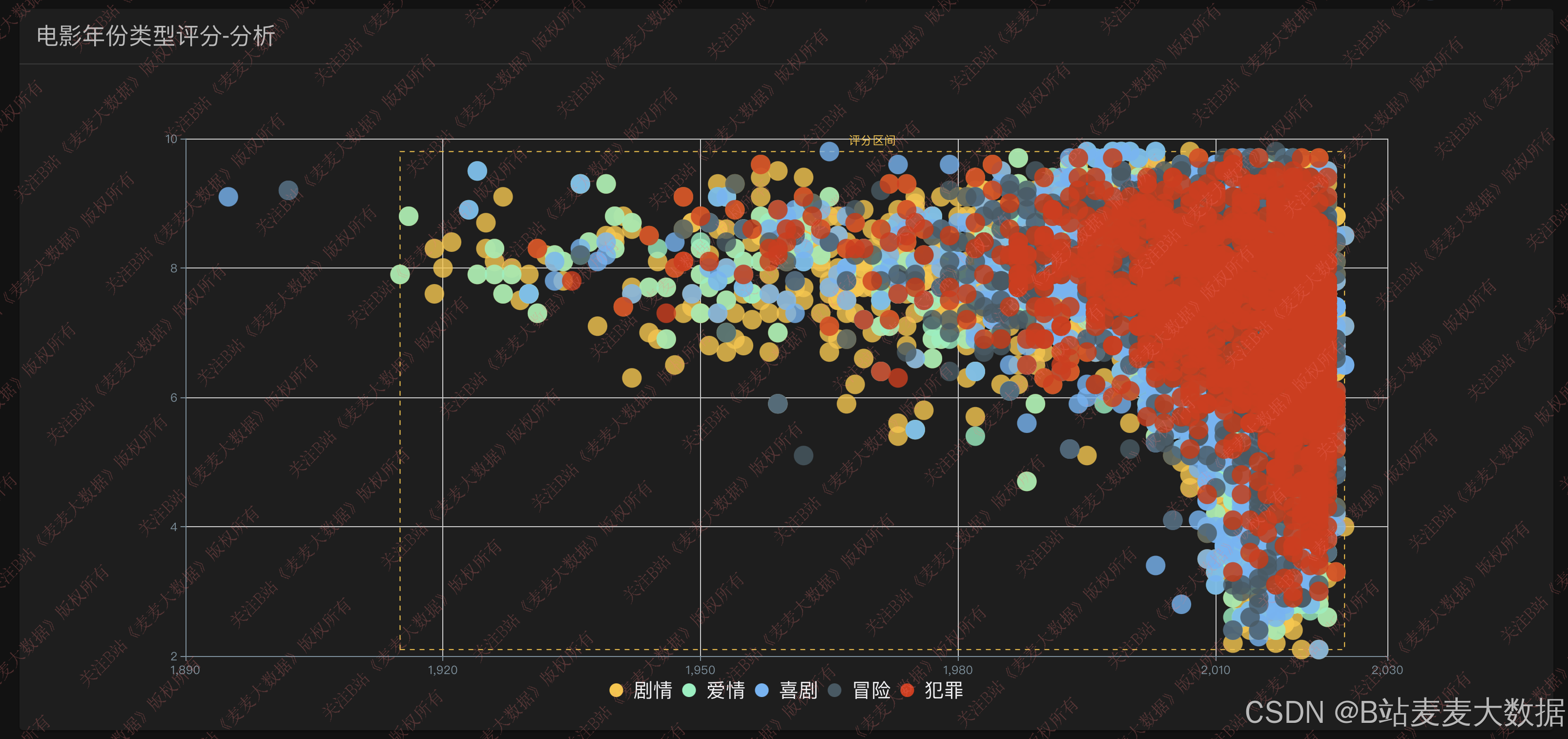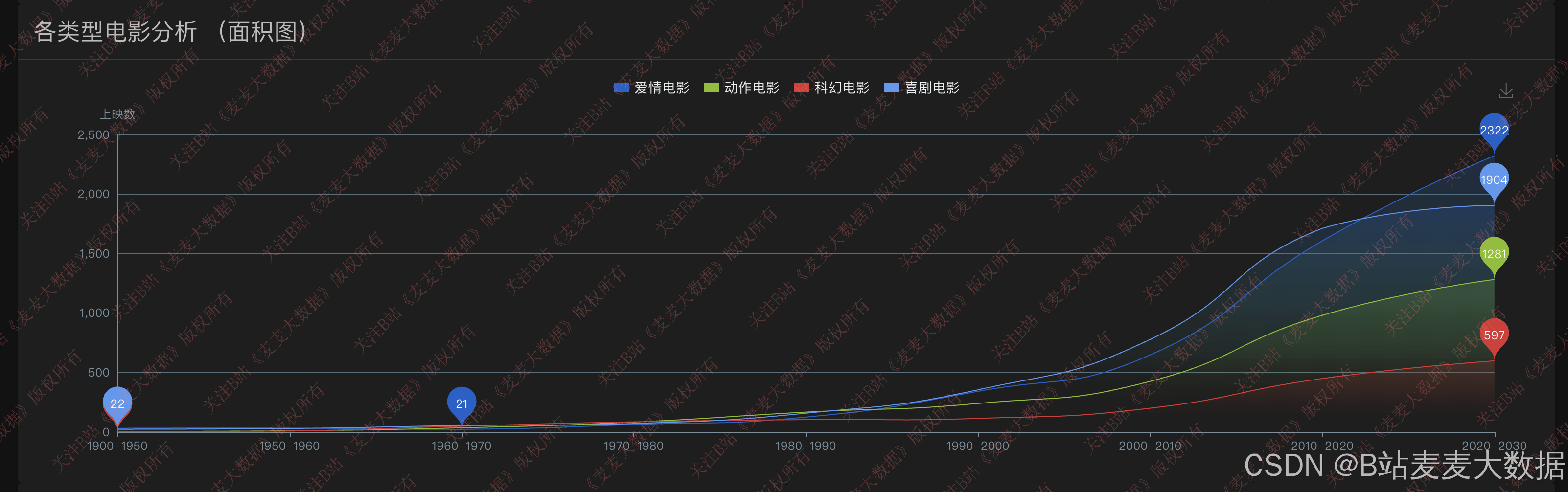 - 类型电影上映分析:展示不同电影类型在各年份的发行量,使用面积图揭示类型变迁;