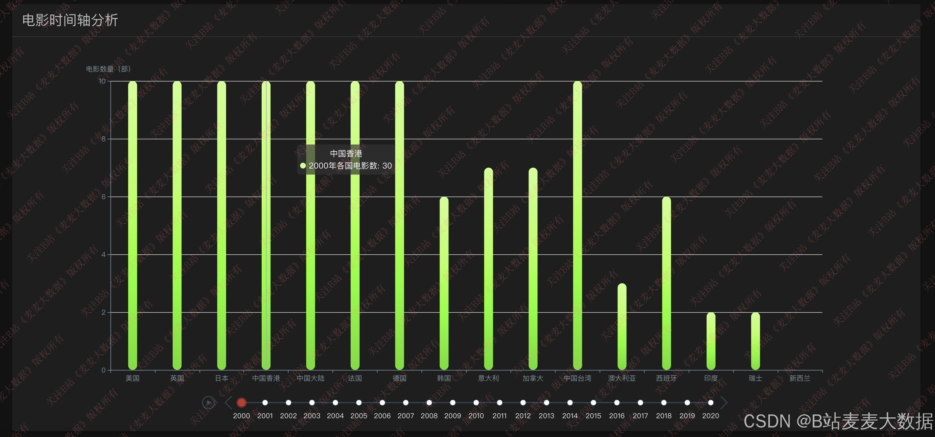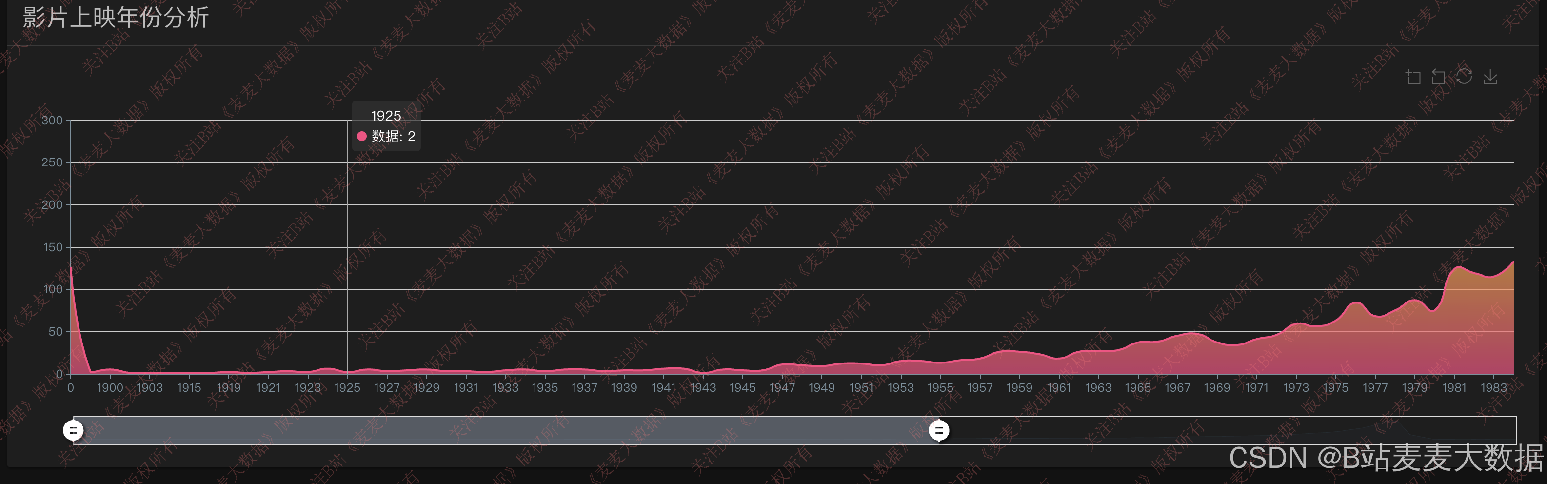 - 电影上映统计:按年份区间展示电影上映数量柱状图,反映行业热度趋势;