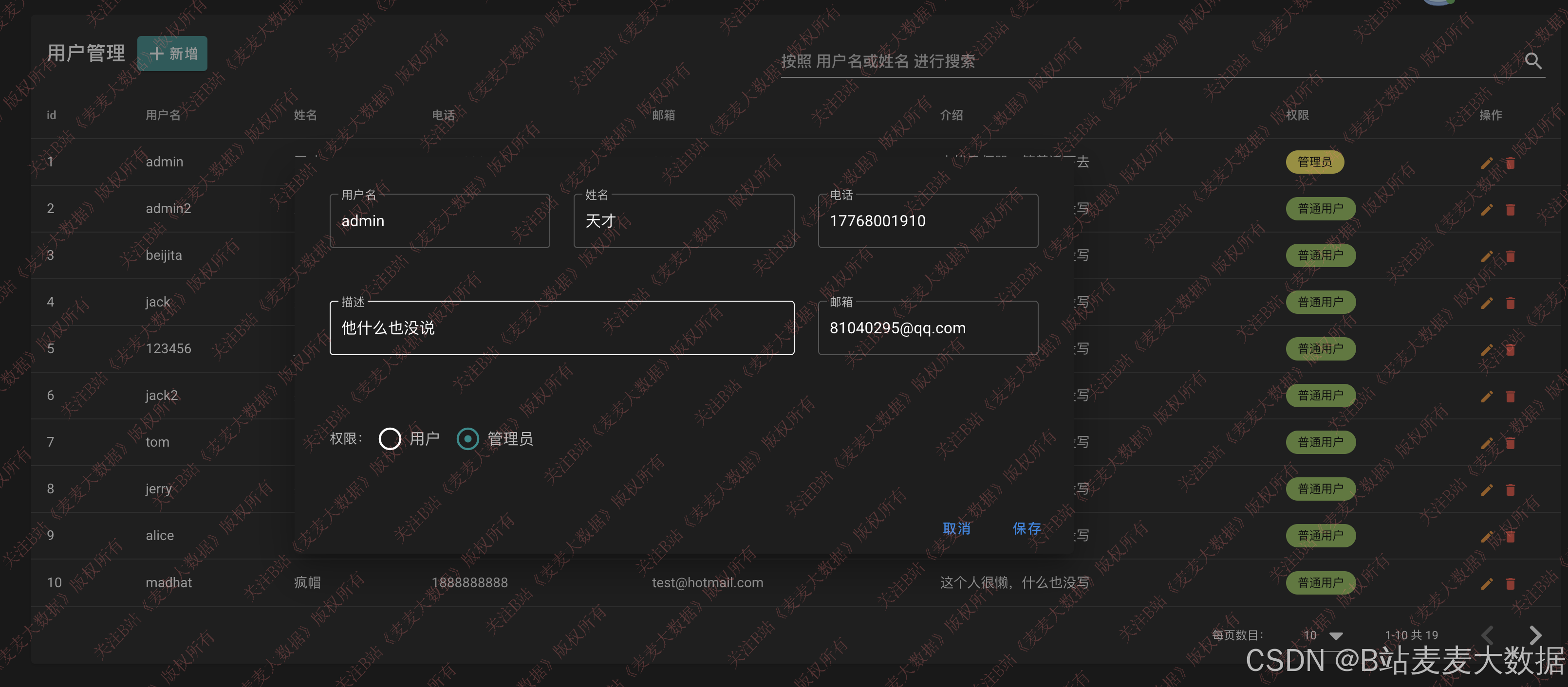 管理员登录后可进入用户管理页面,实现: