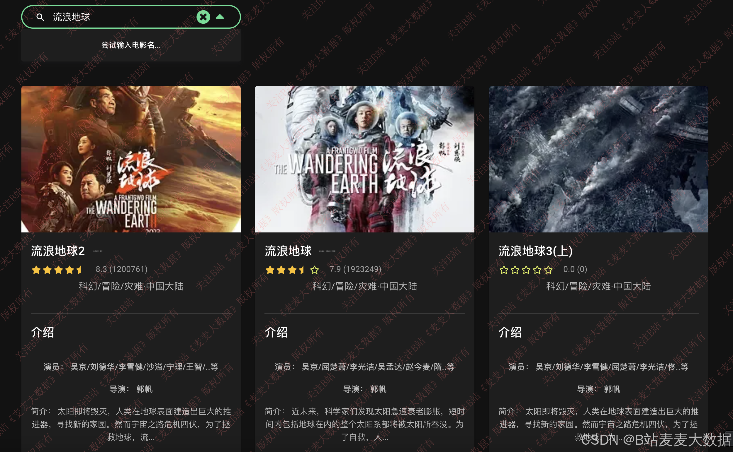 电影库模块支持用户通过输入关键词进行模糊搜索 ,可在电影名称或别名字段中进行查询。为提升用户体验,系统采用前端响应式设计 和搜索防抖机制,防止高频请求,仅在用户输入停止后触发搜索请求。搜索结果以卡片形式展示,包括电影封面、名称、评分(豆瓣评分)及简介等关键信息。