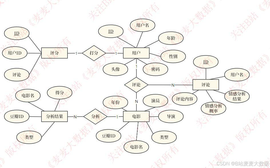 用户实体包含了用户的基本信息,如唯一标识ID、用户名、年龄、性别、头像和密码。同时,用户与"评论"实体通过"1对N"的关系相连,表示一个用户可以发表多条评论。