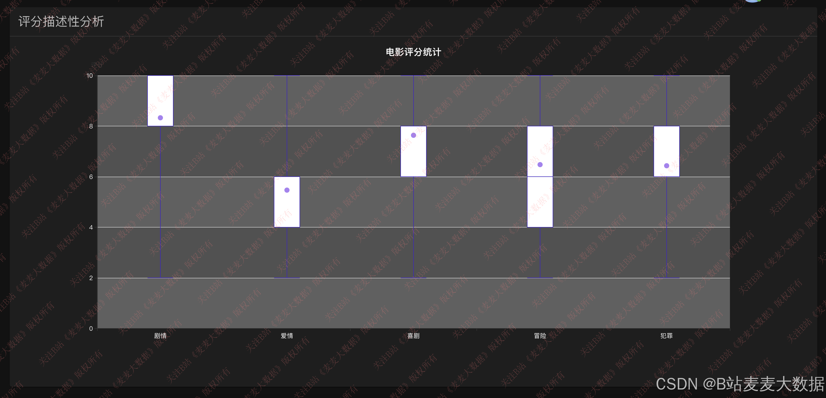 - 箱线图分析:展示不同电影类型的评分分布(均值、中位数、四分位、离群值),揭示评分特征。