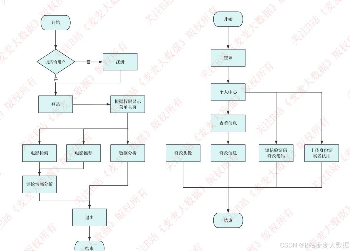 - 数据采集:Scrapy爬虫 → 获取电影详情与评论数据 → 清洗 → 存入MySQL。