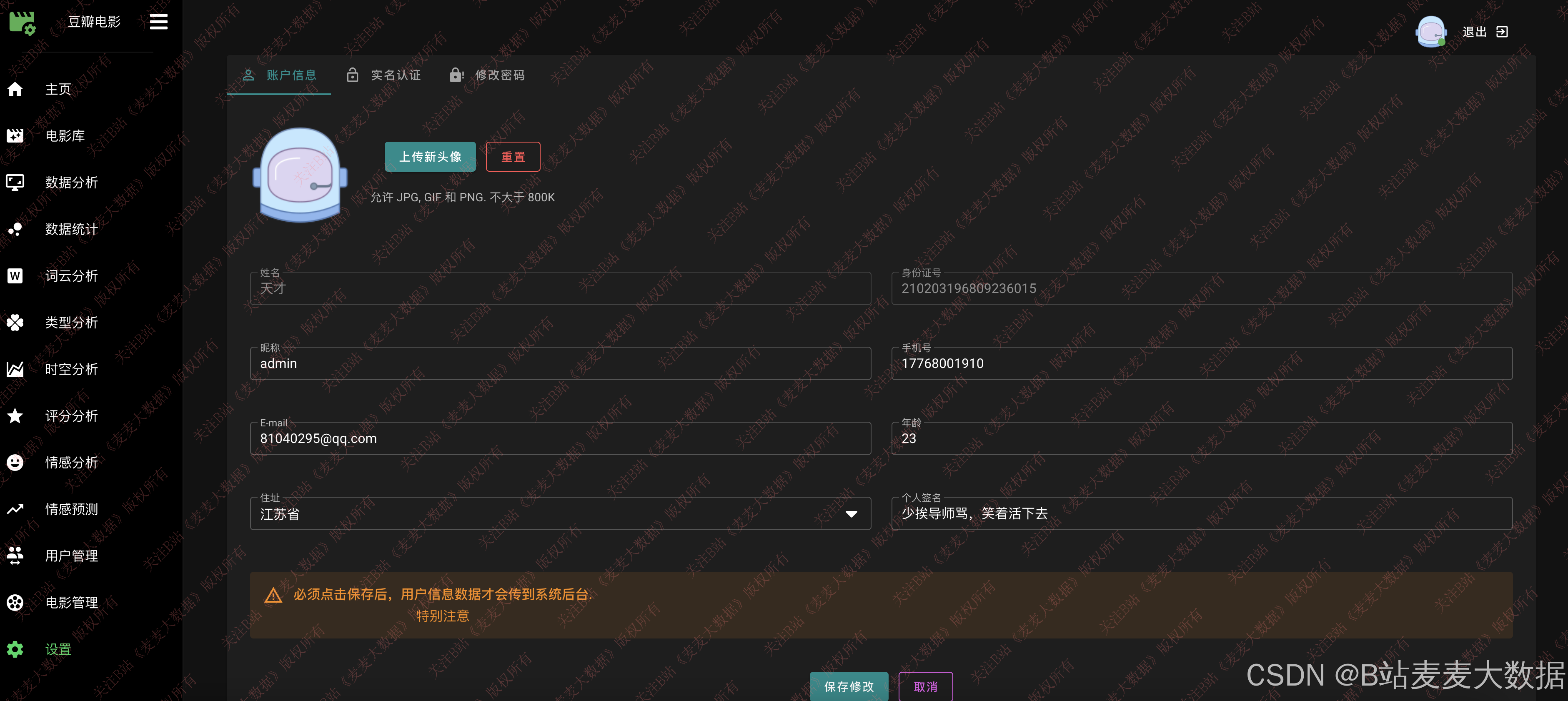 - 个人设置模块:支持头像上传、个人信息修改与密码重置。