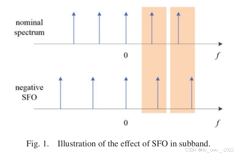 关于 SFO,它会导致频谱扩展或压缩。当进行子带信号处理时,对于 SFO 的影响存在一种近似等效性。如图 1 所示,每个子带在频谱中用一个箭头表示。上图表示标称采样频率下的频谱,下图显示了具有负 SFO 的频谱。当我们将注意力集中在一个子带时,SFO 的影响主要表现为平移,类似于 CFO。特别是当子带足够窄时,子带的扩展或压缩是可以忽略不计的。那么在子带信号处理中,SFO 可以高精度地等效为 CFO。