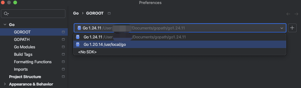 由于最近手动清理了macos的缓存,包括go缓存,导致"项目X"中go1.24 sdk 环境没有了。我本地全局环境是go1.20.14。"项目X"使用的是go1.24环境。