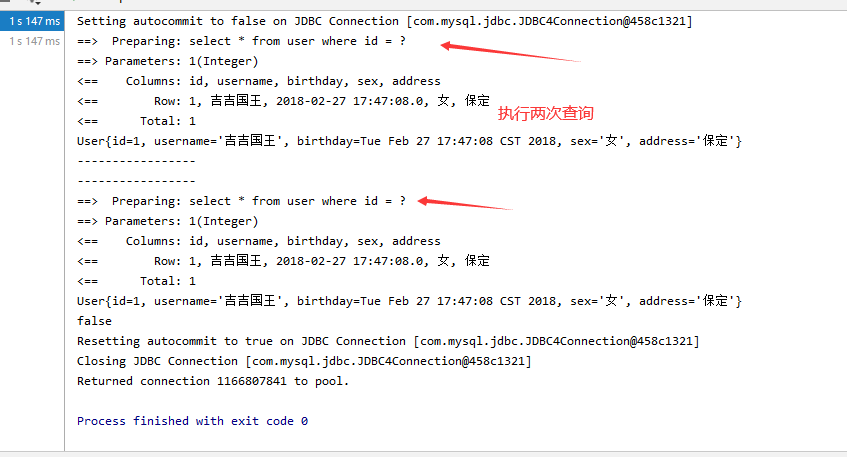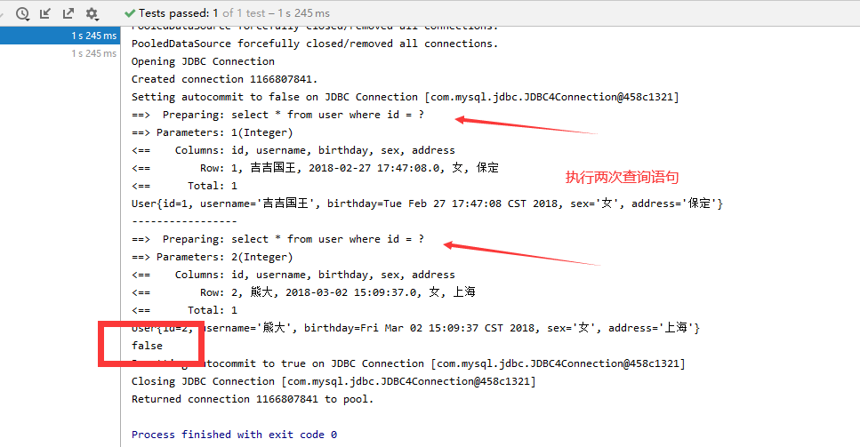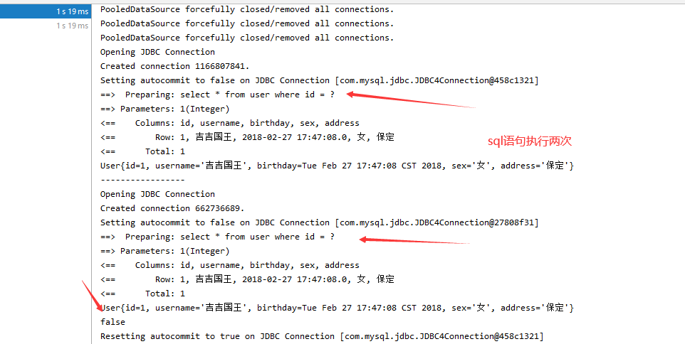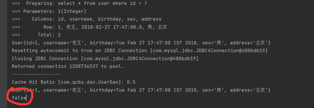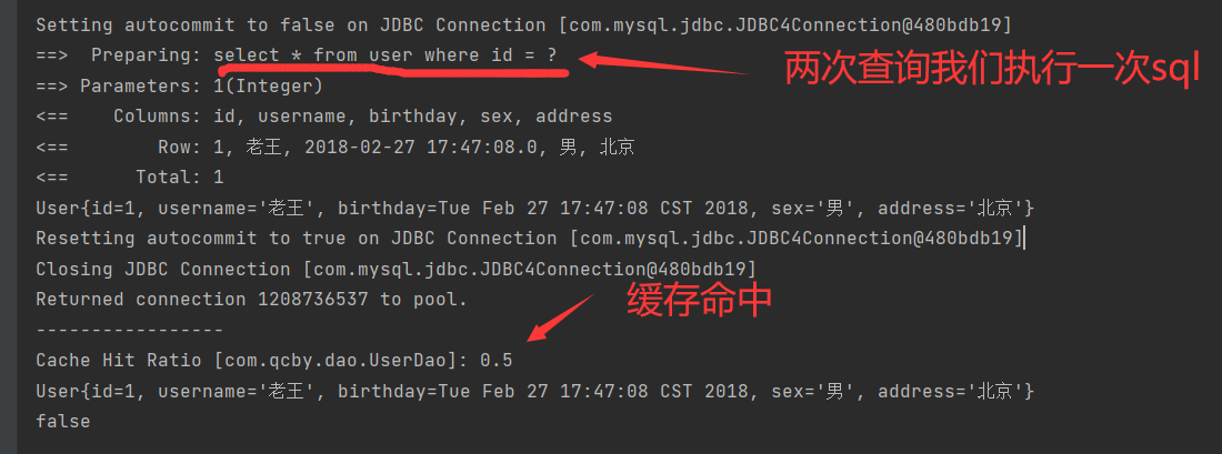 打印发现2个对象的地址值不一样,但是确实只发送了一次SQL语句的查询,二级缓存中存储的是数据,不是对象。