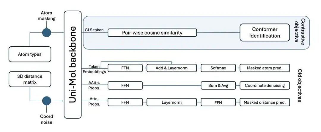 它的核心思路很直观。想象一下,给你看同一个人的多张照片------一张站着,一张坐着,一张在跑步。你一眼就能认出这都是同一个人。ConforFormer 的工作原理也类似。研究者首先为每个分子生成一组合理的、能量较低的 3D 构象。然后,他们用一种叫做对比学习 (contrastive learning) 的方法来训练模型。