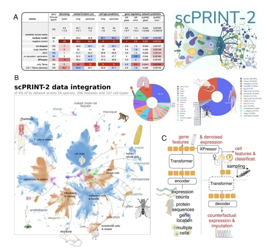 - 通过在史无前例的 3.5 亿细胞数据集上预训练,scPRINT-2 为单细胞分析设定了新的性能天花板,尤其在跨物种泛化能力上表现突出。