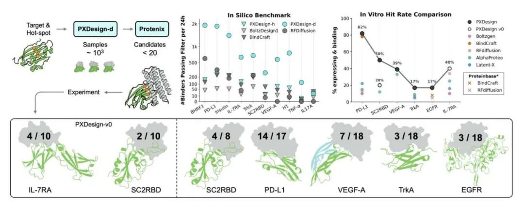 在药物研发领域,从头设计一个能精确结合靶点的蛋白质,就像是为一个只见过照片的锁,凭空打造一把钥匙。许多计算方法在电脑里看起来很完美,但一到实验室里就现了原形。这就是为什么看到 PXDesign 的实验数据时,会让人眼前一亮。