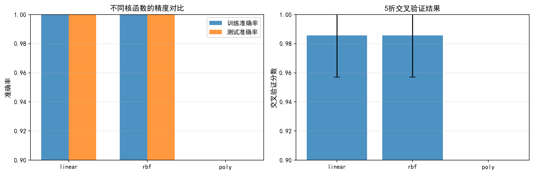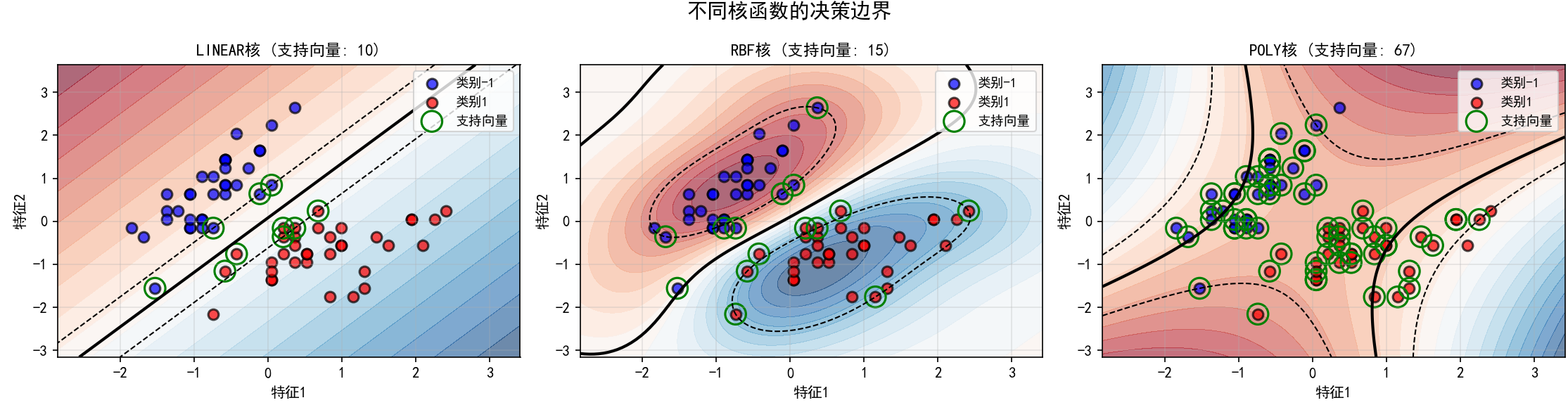 核函数的选择对SVM的性能有很大的影响。一般来说,对于低维问题或当特征之间具有较强的线性关系时,线性核通常就足够了,而且计算速度最快。对于中等维度的问题,多项式核提供了一个很好的折衷。对于高维问题或特征之间关系复杂时,高斯核通常是一个很好的选择,但需要谨慎调整$$\gamma$$参数以避免过拟合。