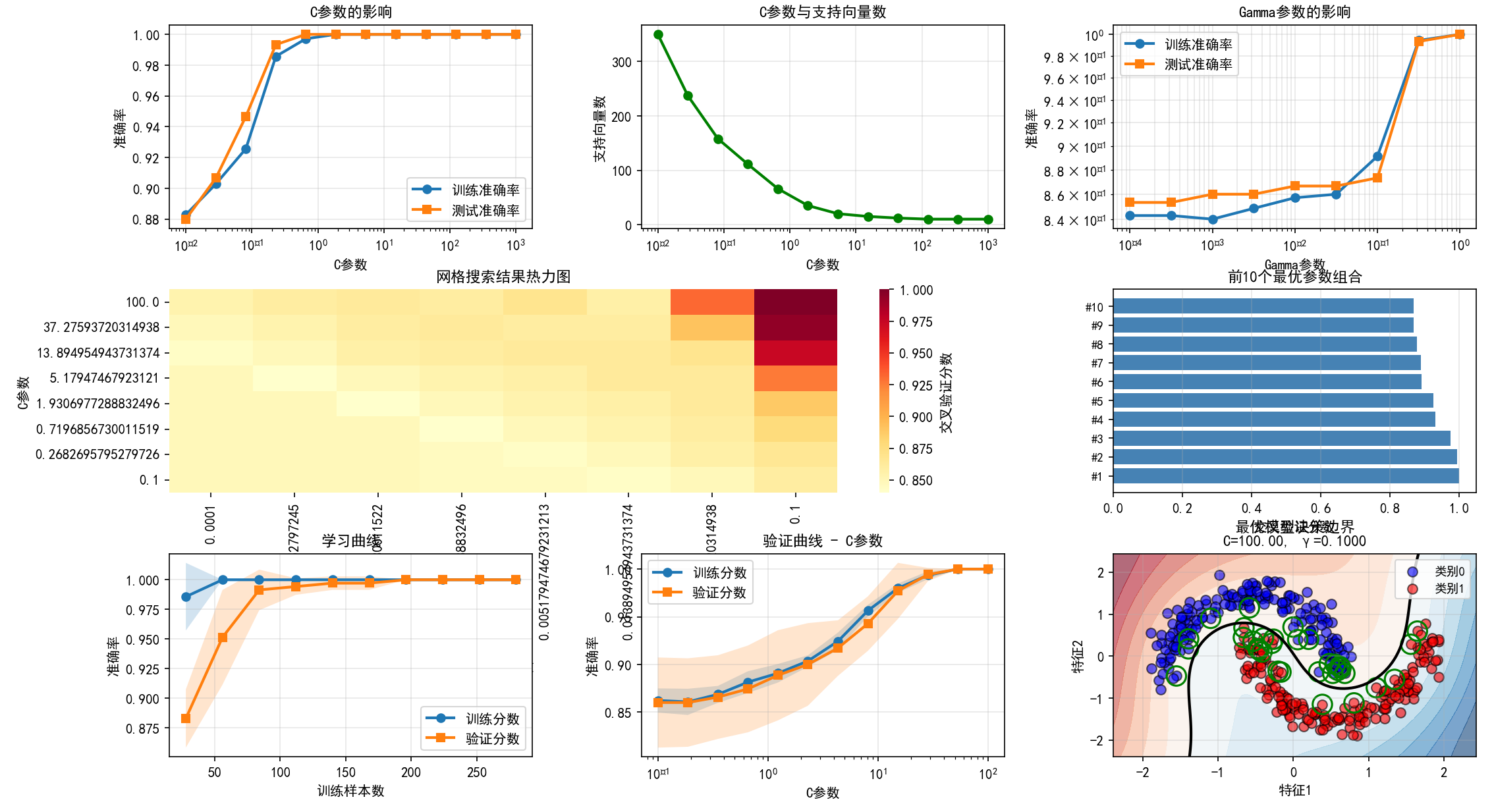 然而,SVM也有其局限性。首先,SVM在处理大规模数据集时的计算复杂度是平方级的(关于样本数量),这在样本数量很大时会成为瓶颈。现代的实现使用了各种技巧来加速(如SMO算法),但与线性模型相比仍然较慢。其次,SVM的可解释性有限,特别是在使用非线性核的情况下,很难直观地理解模型为什么做出特定的决策。这对某些需要高透明度的应用(如金融、医疗诊断)可能是一个问题。第三,SVM在处理多分类问题时需要使用一对一或一对多的策略,这可能导致额外的计算复杂度。第四,SVM需要仔细的参数调优,特别是C和gamma参数的选择对模型性能有显著影响。