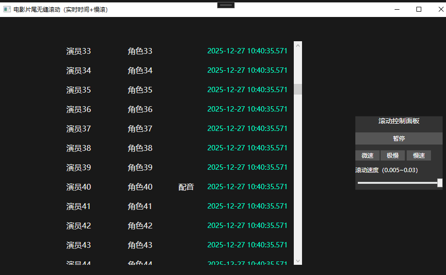 这套代码基于 WPF + MVVM 架构 开发,兼容.NET Framework 4.0,核心实现电影片尾演员表的极致慢滚 + 无缝接续 ,同时在表格中显示实时更新的系统时间,且滚动与时间更新互不干扰,是一套兼顾视觉效果、性能和易用性的 WPF 桌面应用方案。