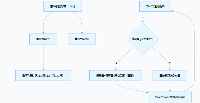 - 无缝重置:当滚动偏移超过原始数据高度时,自动减去原始高度,实现 "循环滚动";