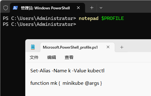 notepad $PROFILE打开配置文件,其中添加了别名k映射到kubectl,并定义了函数mk用于简化 minikube 启动命令,提升 Kubernetes 操作效率。配置将在下次启动 PowerShell 时自动生效。
