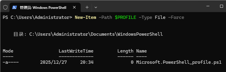 New-Item -Path $PROFILE -Type File -Force成功创建了当前用户的 PowerShell 配置文件,路径为C:\Users\Administrator\Documents\WindowsPowerShell\Microsoft.PowerShell_profile.ps1,文件已生成但内容为空,可编辑以自定义环境。