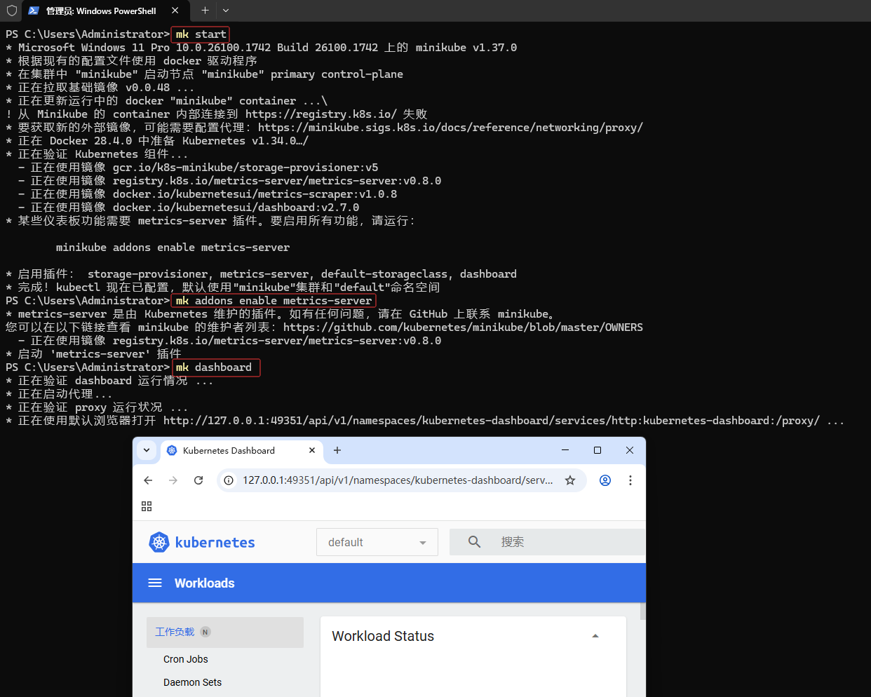 mk start启动 minikube 集群,启用 metrics-server 插件并访问 Kubernetes Dashboard,验证了本地开发环境的完整部署。命令行与图形界面联动正常,表明配置和网络设置均正确,可进行后续 Kubernetes 操作。