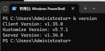 k version成功输出 kubectl 版本信息,说明别名k已正确加载并生效,配置文件中的Set-Alias命令成功应用,PowerShell 环境配置完成,可正常使用简化命令。