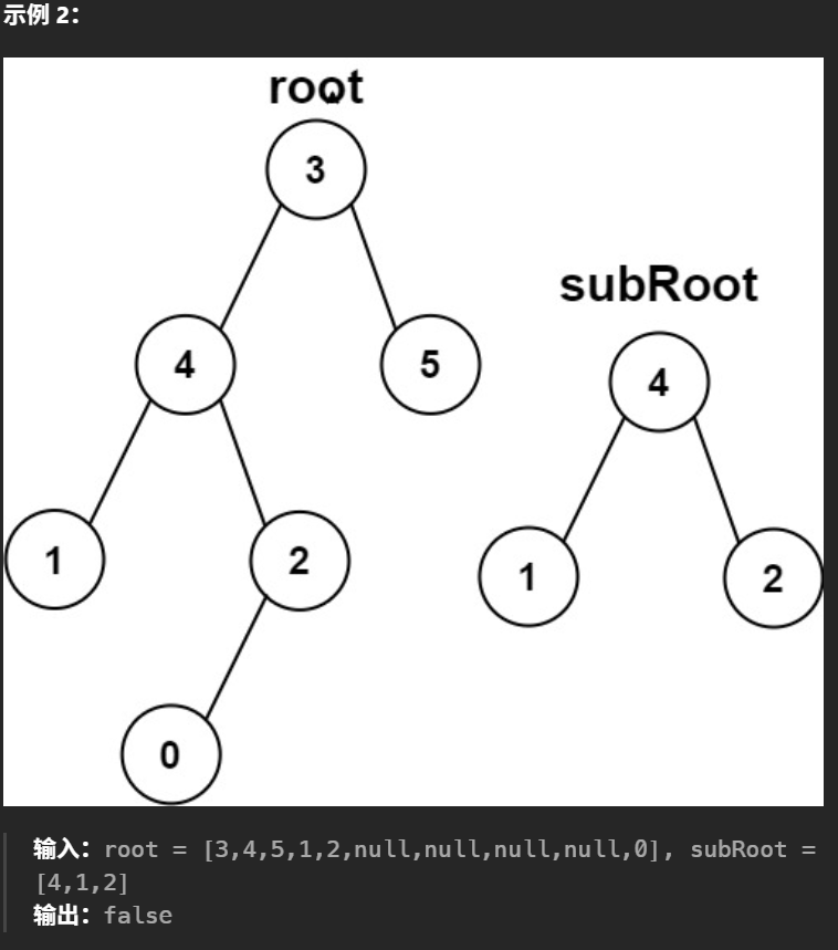 但是在实例2中,root在包含subRoot的情况下还有一个左树2,但是判为false,那么就可以理解为某个根节点下必须是和subRoot一模一样才能被认定为true(因为还需要算后代)。