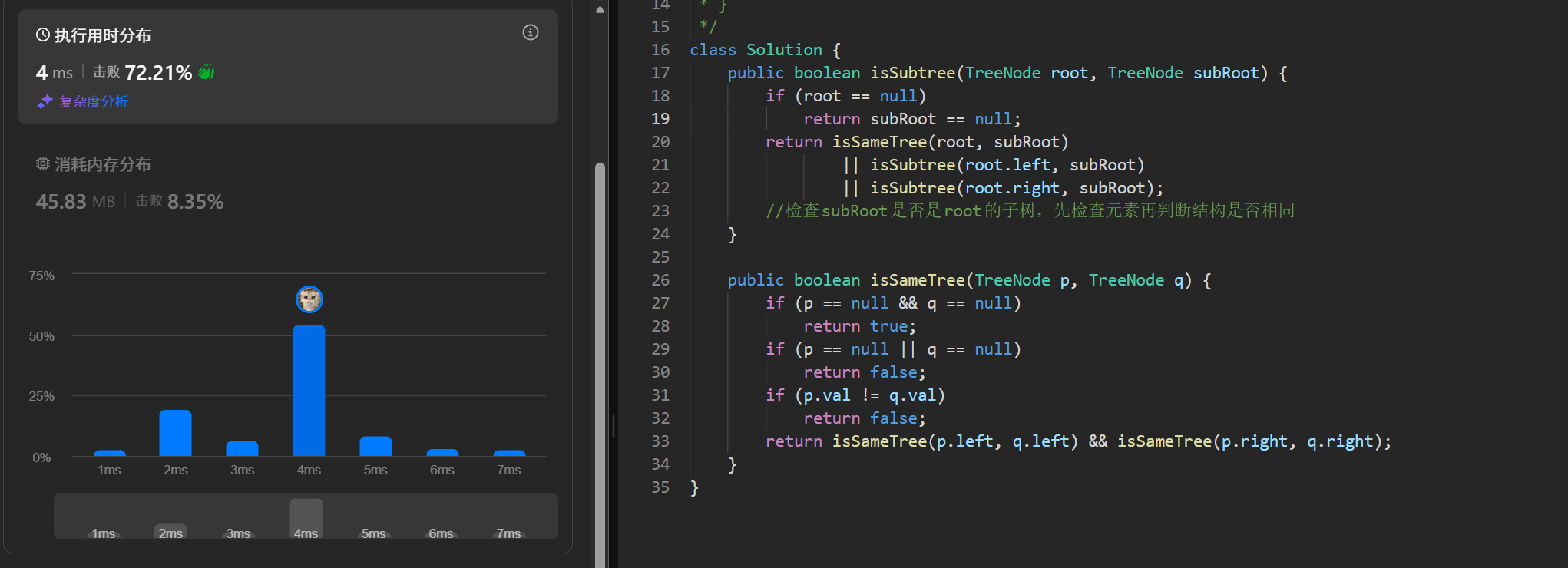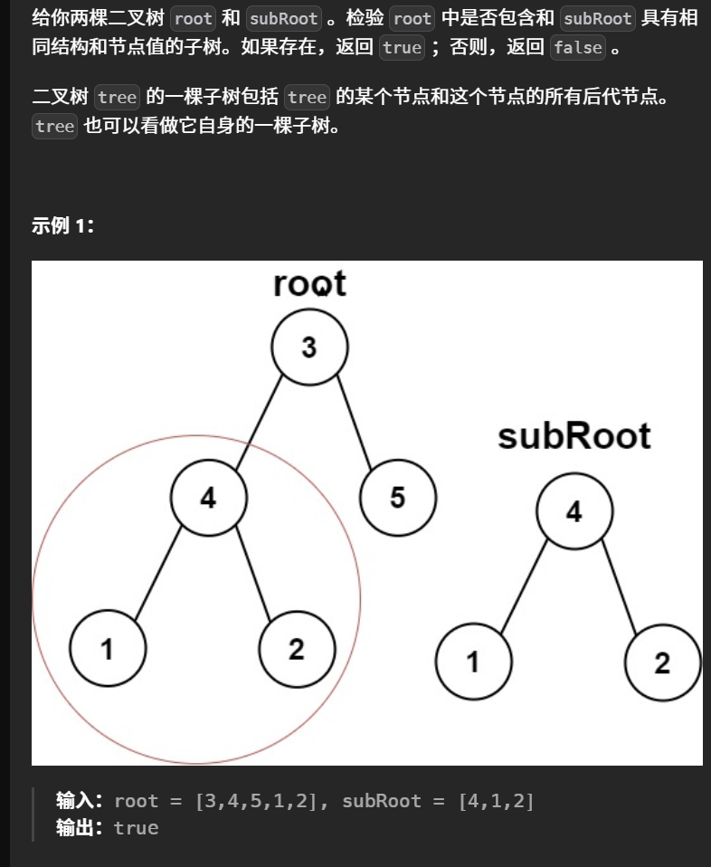 其实理下来之后感觉出了多了一些异常情况的处理之外,和判断两棵树是否相同很像,我觉得还要判subRoot是否是root的子树,要先判断结构在判断值是否相同。