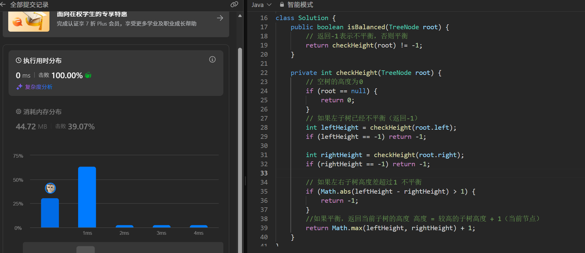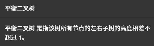 - 我们需要找到根节点的左树度数和右树度数,然后将这两个度数相减,只要最终结果不超过1就可以判断为平衡二叉树
