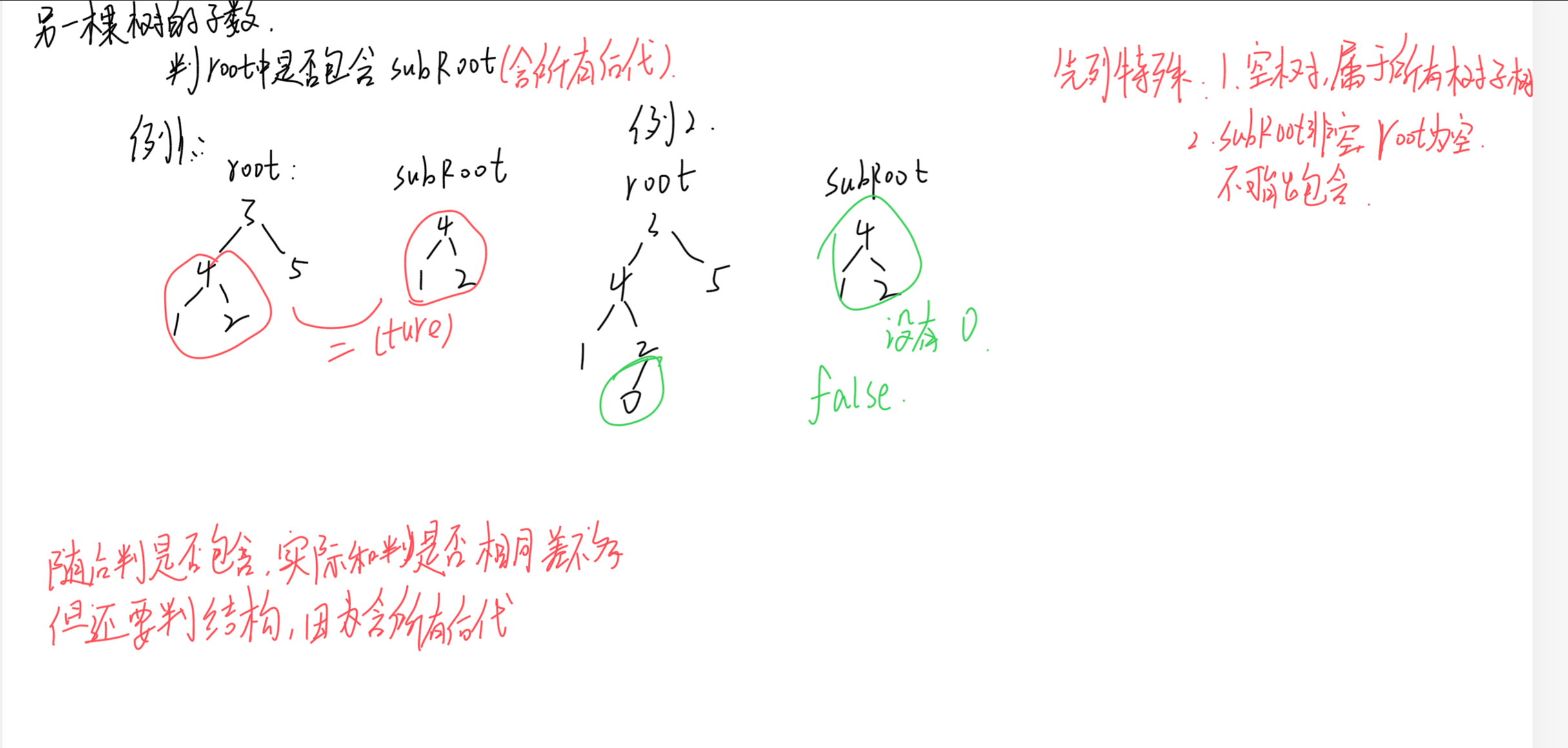 首先,如果root是一个空树且subRoot不为空树,那么root无法包含subRoot,是false。然后如果两个都是空树,可以认为是true。再是root不为空而subRoot为空,这个是true,因为空树是任何数的子树。