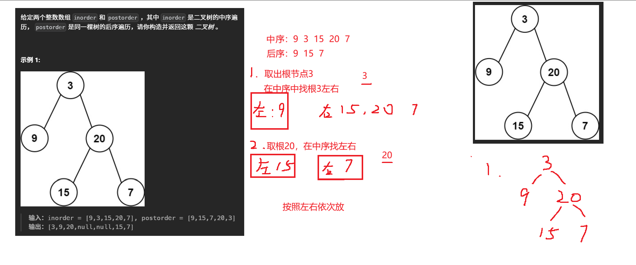 做这道题之前,我们先回顾一下中序遍历和后序遍历,中序遍历是左-根-右,后序遍历是左-右-根