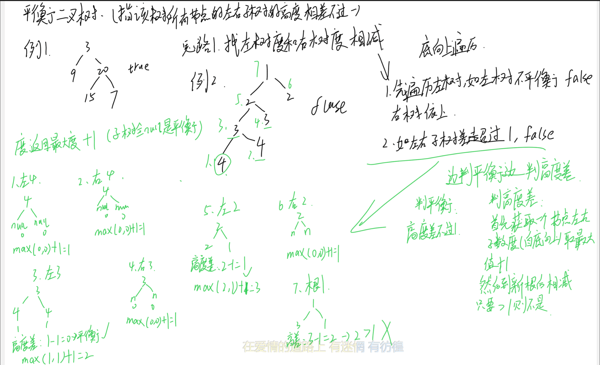 - 判断高度差的方法:我们先获取一个节点的左右子树的度(依据第二条里面的顺序),然后获取左右子树的高度差是否是1(如果一个节点的左子树或者右子树此前已经判断过则这个节点对应的子树继承上一次的度。)。度数取节点左右子树的最大值+1(比如上面笔记图里面的)。