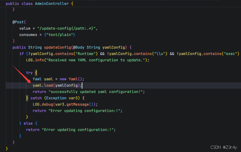 if (!yamlConfig.contains("Runtime") && !yamlConfig.contains("\\u") && !yamlConfig.contains("exec") && !yamlConfig.contains("com.sun.rowset.JdbcRowSetImpl") && !yamlConfig.contains("org.springframework.beans.factory.config.PropertyPathFactoryBean") && !yamlConfig.contains("org.springframework.aop.support.DefaultBeanFactoryPointcutAdvisor") && !yamlConfig.contains("javax.management.BadAttributeValueExpException") && !yamlConfig.contains("org.apache.commons.configuration.ConfigurationMap"))