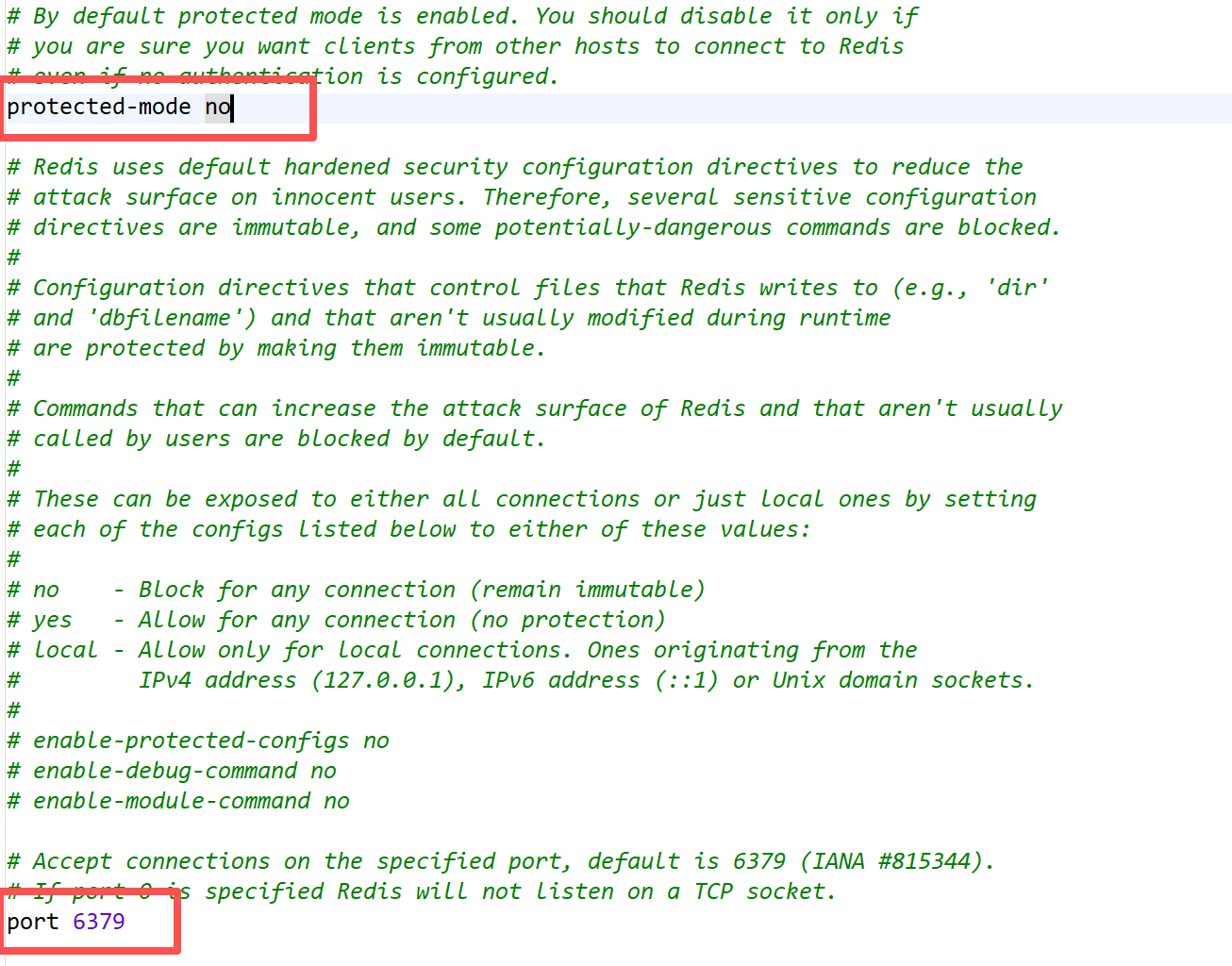 将protected-mode设置为no,避免因未配置密码或非本地连接导致拒绝访问。