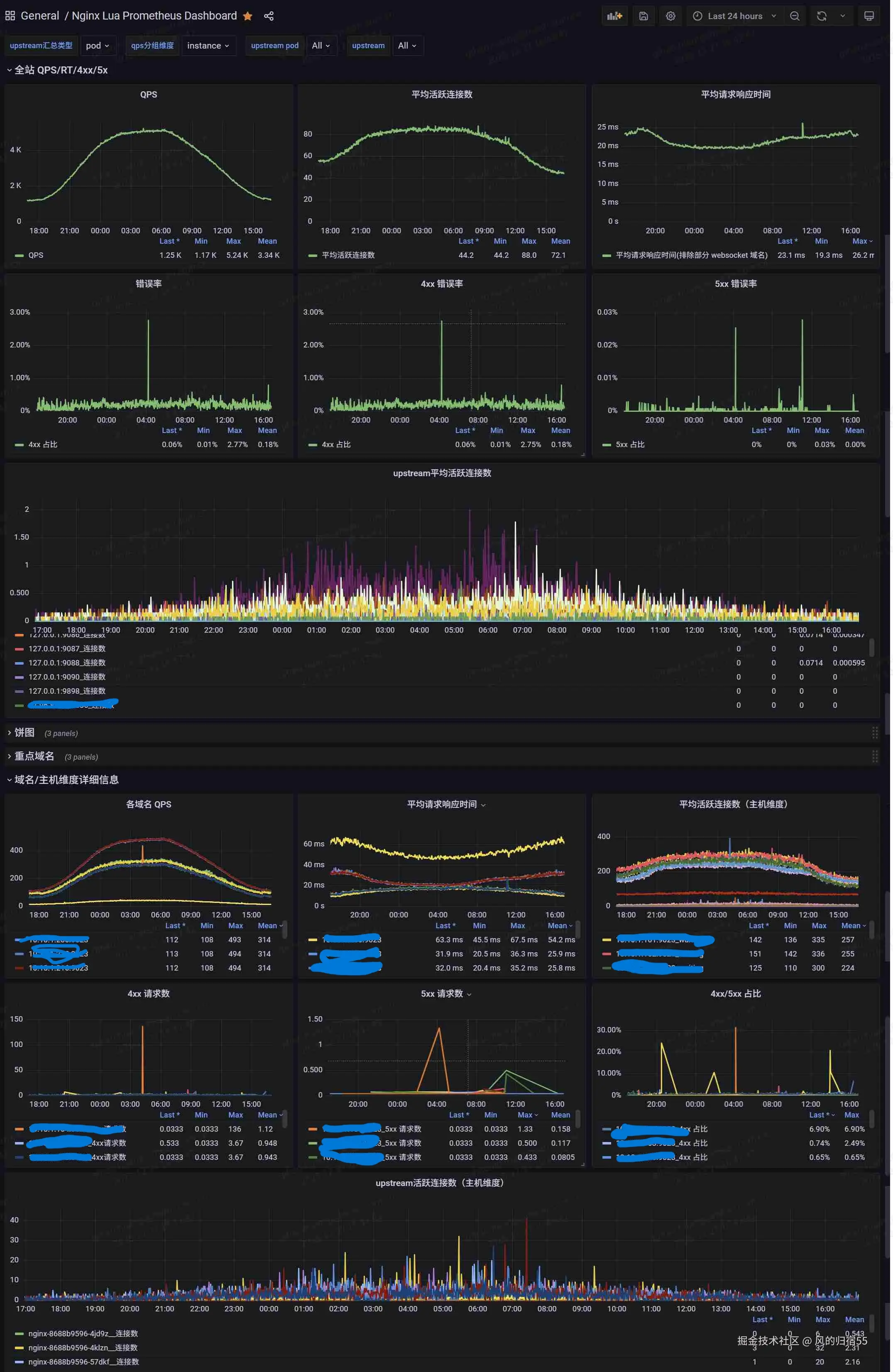 安装完之后,就可以看到上面成果介绍中的nginx监控大屏的效果了,他可以同时监控多个nginx实例,上半部分的全站监控数据,展示了所有nginx实例汇总过后的qps,连接数,错误数,延迟等信息,下半部分是按照主机维度或者pod维度汇总的对应数据。下面简单的介绍下:
