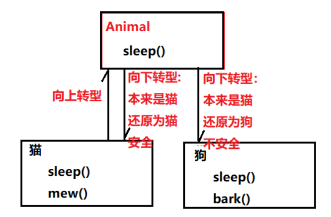 将⼀个⼦类对象经过向上转型之后当成⽗类⽅法使⽤,再⽆法调⽤⼦类的⽅法,但有时候可能需要调⽤⼦类特有的⽅法,此时:将⽗类引⽤再还原为⼦类对象即可,即向下转换。