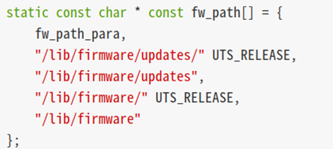 request_firmware为内核下固件更新子系统的调用接口,fw为用于保存申请到的固件,name为固件名,device为申请固件的设备结构体。如果申请成功,则返回0,失败会返回一个负值。该固件子系统将固件以二进制文件形式存储于文件系统之中,在内核启动后再从用户空间将固件传递至内核空间,解析固件获得参数,最后加载至硬件设备。那么升级的固件要存放在哪个目录下呢?内核下规定了以下目录为firmware子系统查找的路径。
