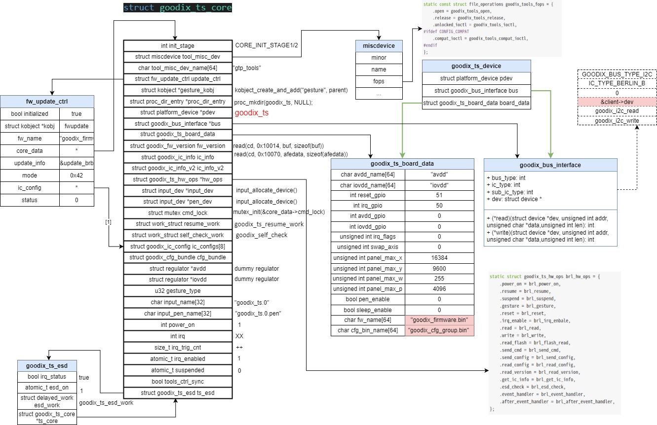 至此,驱动初始化部分结束,接下来是中断的处理,触摸芯片通过中断的方式去响应触摸动作,读取坐标信息。初始化后整个驱动中的数据结构如下。