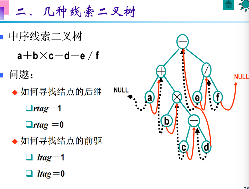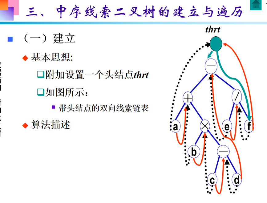a(中序第一个节点):左指针为空,线索指向头结点thrt;右指针为空,线索指向其后继节点+; - 节点