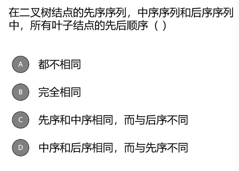 无论先序、中序、后序,叶子节点的访问顺序都遵循 "从左到右" 的自然顺序(因为叶子节点的 "左 / 右子树" 为空,遍历顺序只由它在树中的左右位置决定)。