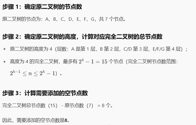 核心思路是:顺序存储需将二叉树补为 "完全二叉树",统计补全后总节点数与原节点数的差值,即为需要添加的空节点数。