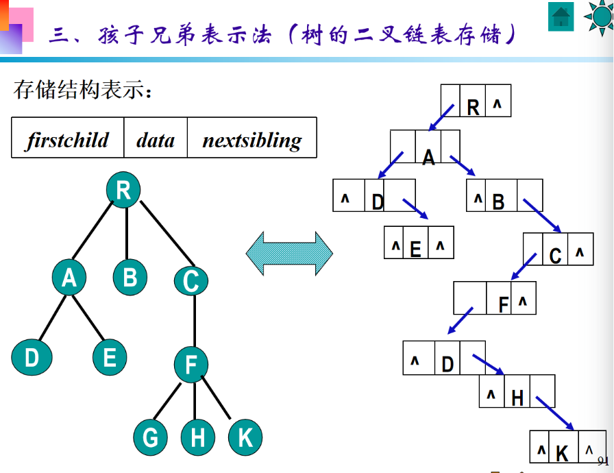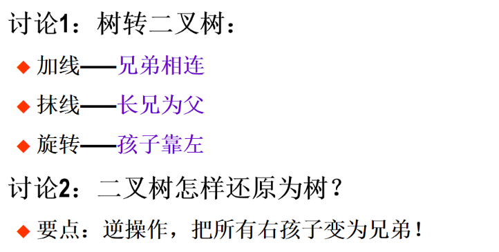 - 操作 :将整个结构以父节点为中心,顺时针旋转一定角度,使每个节点的左子节点是原树的子节点,右子节点是原树的兄弟节点。