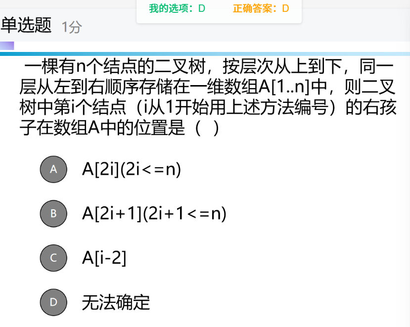 只有完全二叉树(节点按 "从上到下、从左到右" 填满的二叉树),才能用 "第i个节点的左孩子是2i,右孩子是(2i+1)" 的规则确定位置(这也是选项 A、B 的依据)。