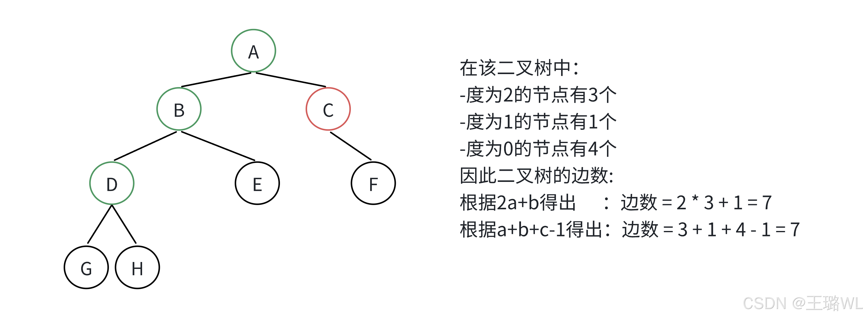 证明上述性质: 假设⼀个⼆叉树有 a 个度为2的节点, b 个度为1的节点, c 个叶节点(二叉树的结点只有三种情况:度为0,1,2),则这个⼆叉树的边数是 2a+b