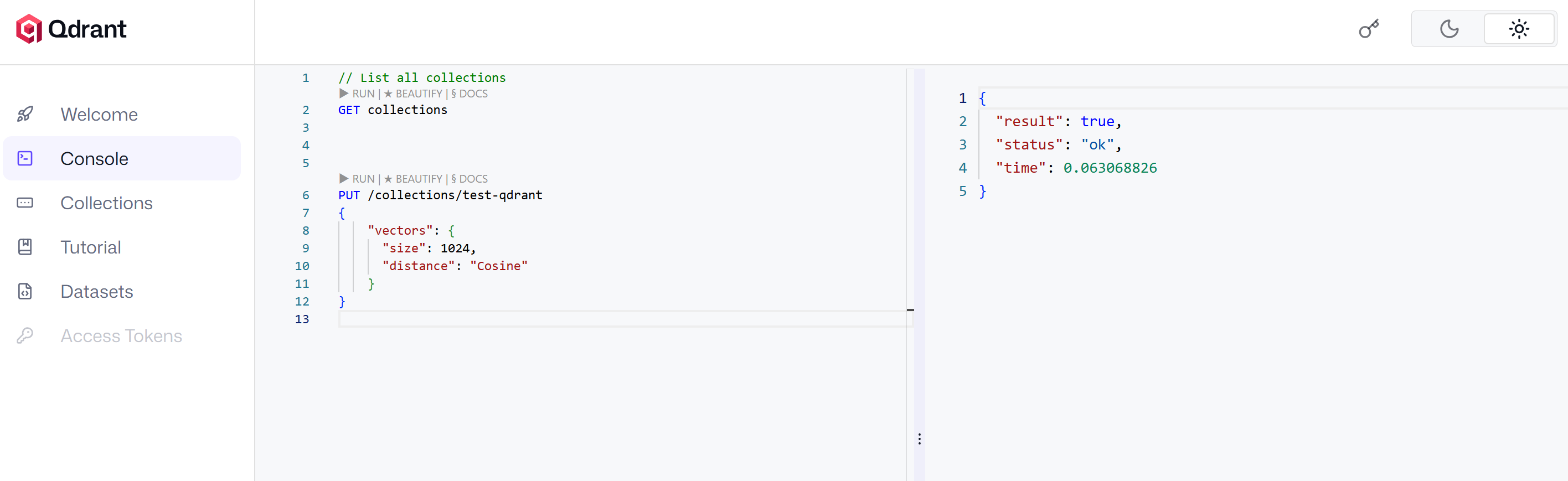 在Dashboard的Console中执行命令,创建一个test-qdrant库,这个步骤和ES还是很相似的