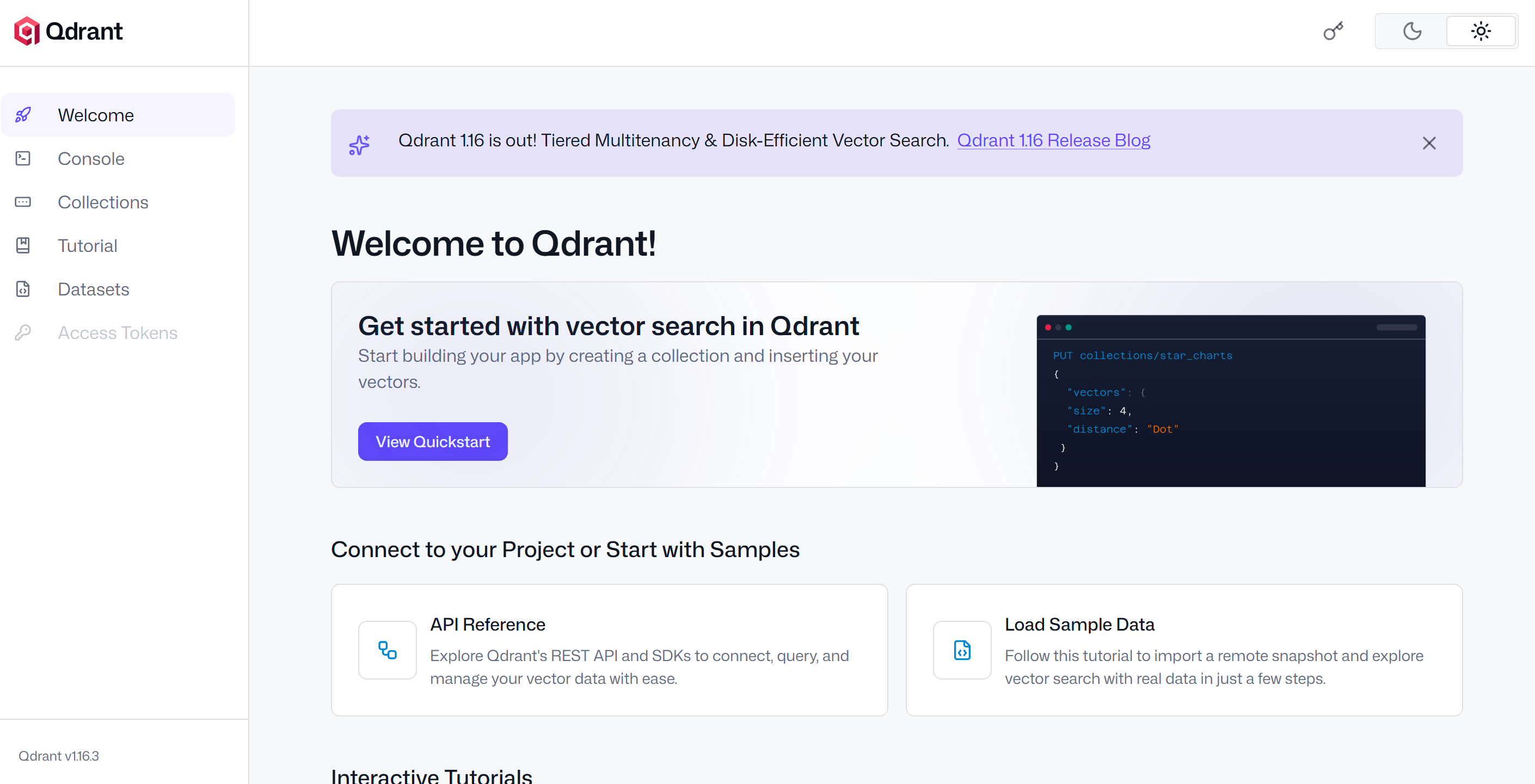 6333端口是浏览器访问控制台用的,6334是grpc协议,用于客户端连接。浏览器打开对应ip的6333端口,访问/dashboard,就可以看见Qdrant的控制台了