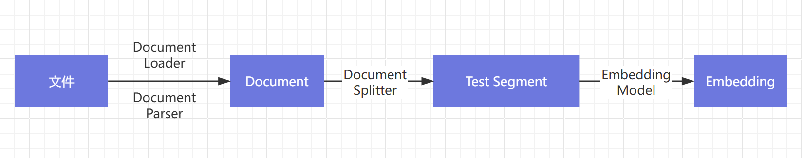 文档经Document Loader加载为Document对象到内存中,通过解析器Document Parser解析为文本,通过分割器Document Splitter进一步转换为片段Text Segment,最终,经向量模型Embedding Model转换为向量Embedding