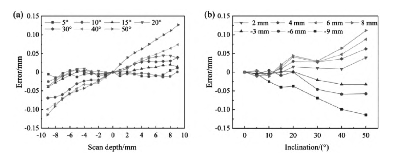 其中 x' 归一化后的扫描深度(对应传感器Z读数),t' 为归一化后的物体表面倾角向量。系数需通过标定块"扫掠试验"求Moore-Penrose广义逆矩阵得出。