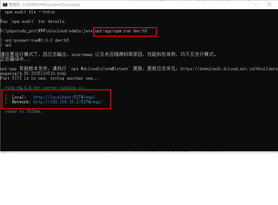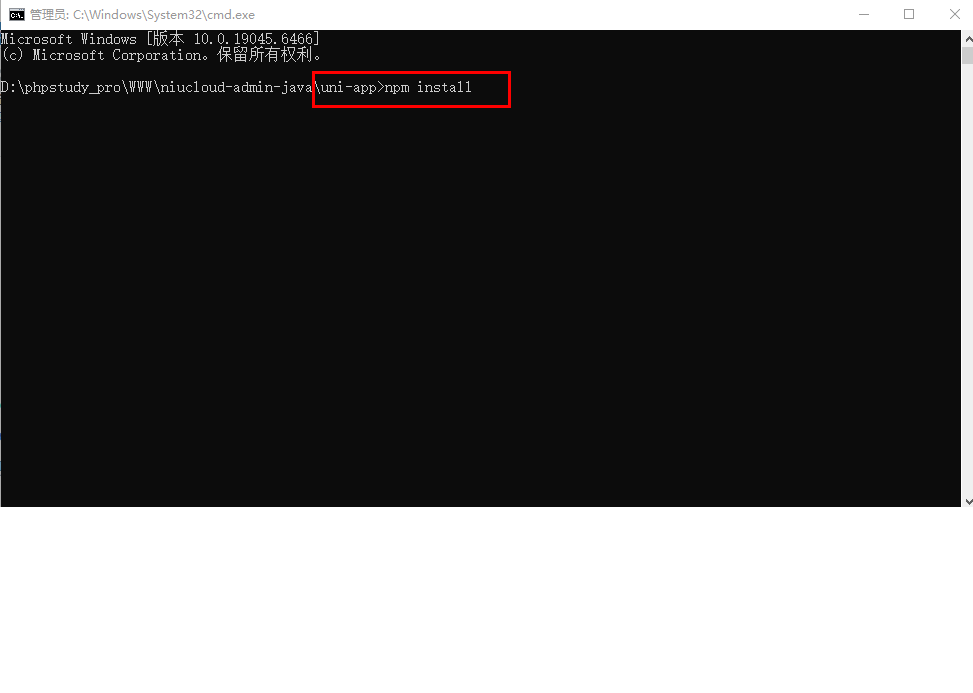 下面开始启动 nodejs 的命令行运行,打开对应 uniapp 目录,首先执行 npm install 安装依赖
