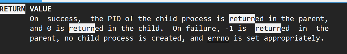 简单翻译一下,如果成功,子进程的PID被返回给父进程,0返回给子进程,如果失败,-1被返回给父进程,没有子进程被创建并且错误码被设置。